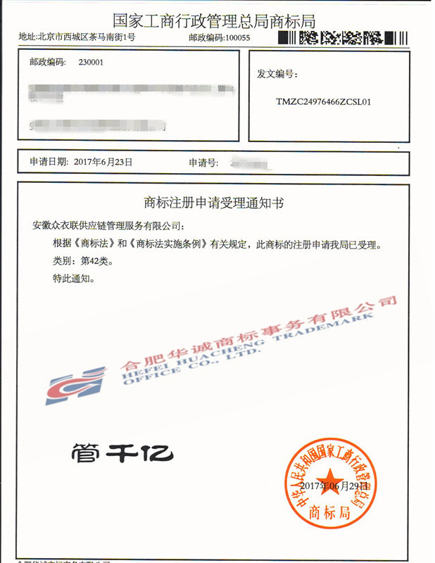 您委托我所代理商标注册申请,名称为“管千亿”42类商标已被国家商标局受理。