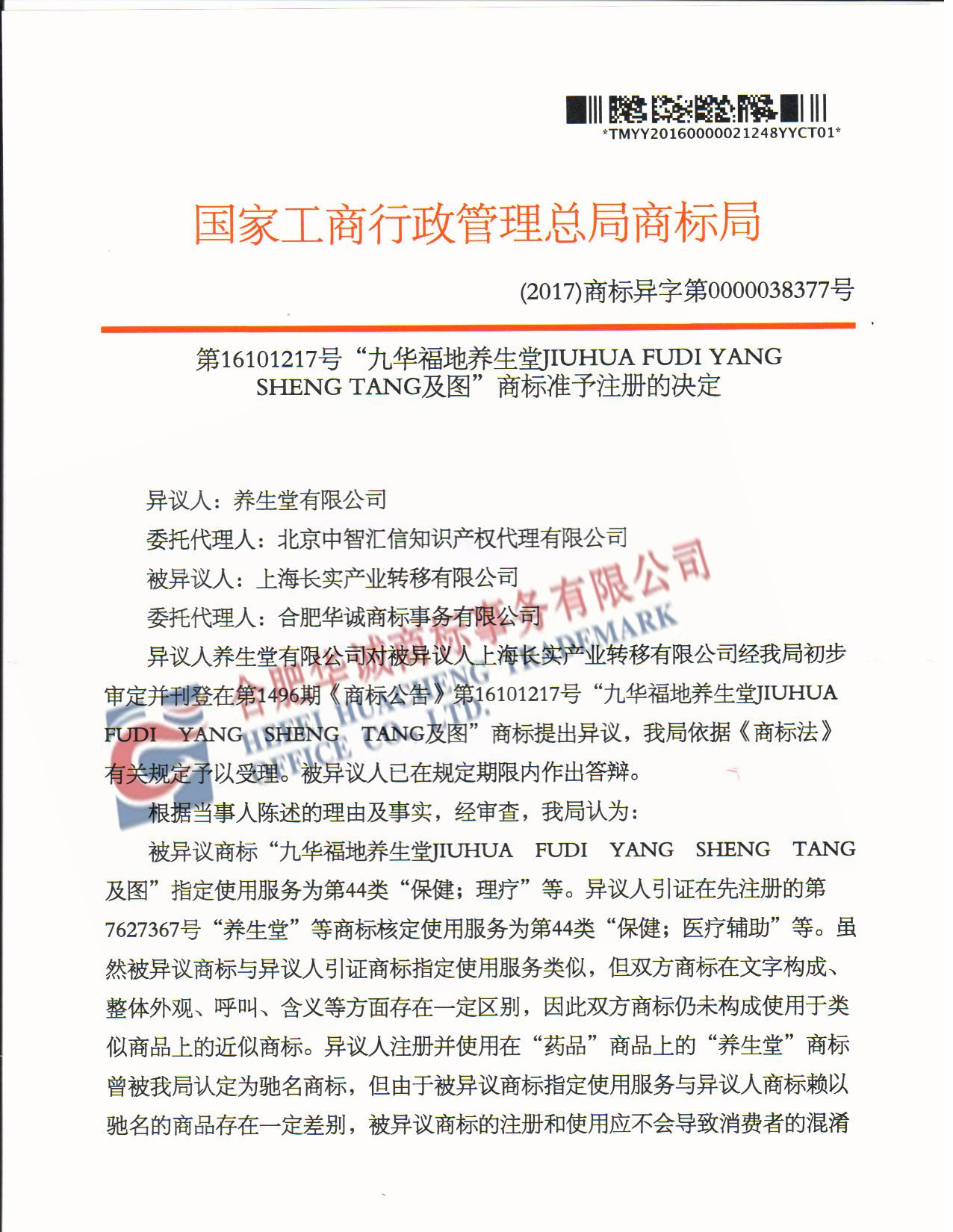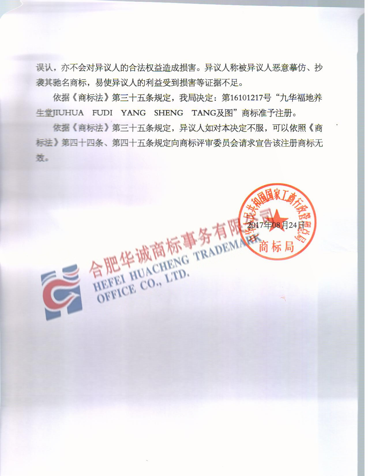 “九华福地养生堂”异议答辩成功裁定