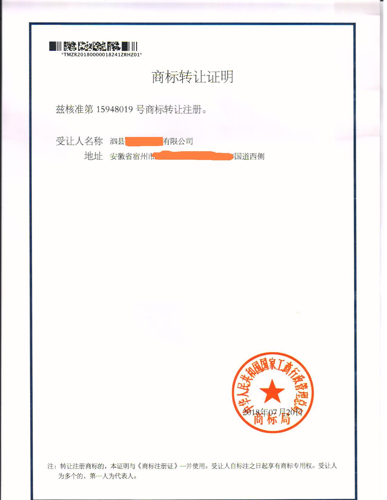 第“15948019”号商标转让证明下达