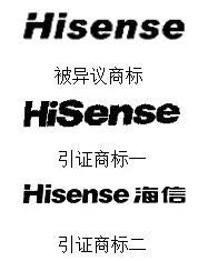 (2016)商标异字第0000003025号《第12786016号“HISENSE”商标不予注册的决定》中国家工商总局商标局认定:第12786016号“HISENSE”被异议商标是由英文构成,与异议人海信集团有限公司在先核准的第669501号“HISENSE”商标(以下简称“引证商标一”)、第3725369号“HISENSE;海信”商标(以下简称“引证商标二”)英文部分完全相同。异议人注册并使用的“电视机”等商品上的“HISENSE”商标已经被商标局认定为驰名商标,被异议商标与引证商标一、二构成近似,已构成对异议人驰名商标的摹仿,核准被异议商标注册使用在“家用器皿”等商品上,容易误导公众,致使异议人的利益是可能受到损害。双方商标的图样截图如下: